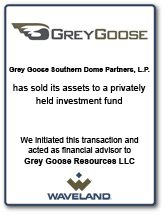 Grey Goose Energy Partners 2002, L.P. was funded in December 2002. 100% of the partnership's assets were sold in September 2004 for a 116.8% pre-tax return of investor capital, including prior distributions from operations. Investors in the partnership also received an up-front tax deduction equal to 95% of their investment.