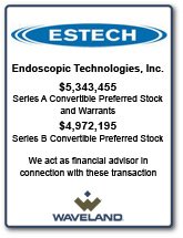 Following the prior rounds of common stock financing, Waveland was able to structure a Series A Preferred Stock financing at the same valuation as the prior common stock financing almost two years prior, thus gaining an extremely favorable risk adjusted return position vis-Ã -vis the common shareholders. At the conclusion of the initial $4 million in Series A financing, Boston Scientific Corporation (NYSE:BSX) invested an additional $1 million, acquiring Series A shares at a valuation of 2x that of Waveland's investors. Estech also entered into a strategic distribution agreement with Boston Scientific.